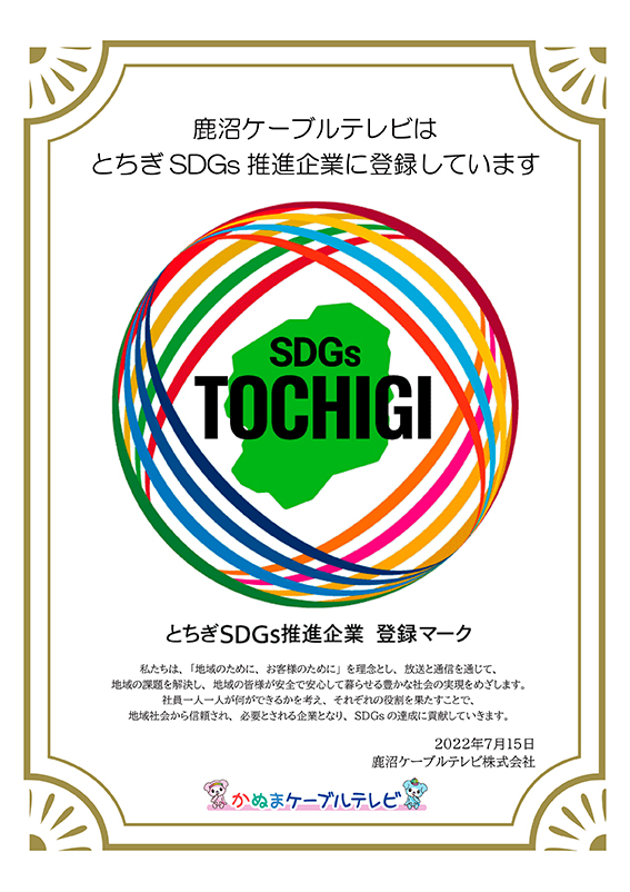 鹿沼ケーブルテレビは、2022年7月15日付けで「とちぎSDGs推進企業」に認定されました。