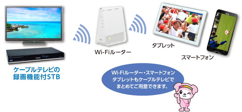 ご自宅のWi-Fi環境で、テレビのない部屋でも、放送中の番組や録画番組を視聴できます。